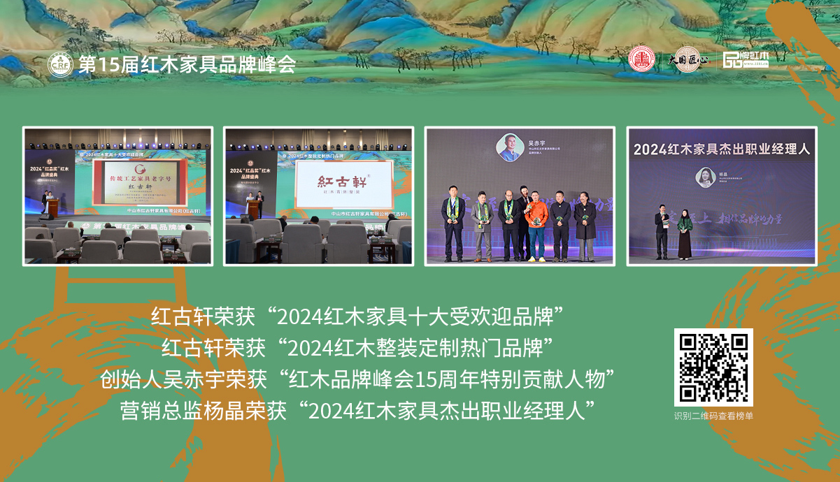 禮遇千年前的中國智慧 格物致知 修身齊家 走進紅古軒 一廿間,二十八載。28年,跨越時代進入新紀元;28年,待時乘勢,根深葉茂;28年,讓新中式成為時代。 創(chuàng)始人故事 1997年創(chuàng)立紅古軒,2002年在紅木行業(yè)提出“新中式紅木家具”。如今,紅古軒以富于藝術(shù)創(chuàng)造的產(chǎn)品與文化引領(lǐng)紅木家具發(fā)展... 品牌故事 品牌榮耀 品牌歷程 人物故事